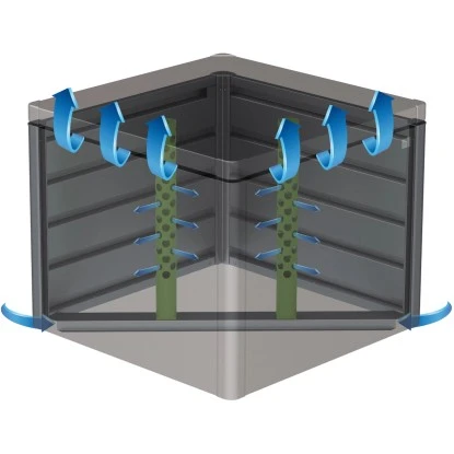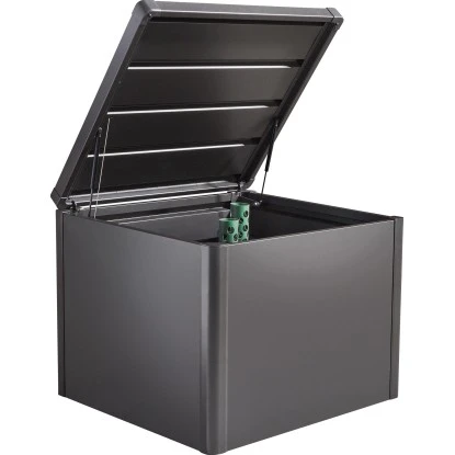 Der Komposter bietet 725 l Volumen und einen Deckel mit Gasdruckfedern. Einfache Entleerung durch hochschiebbare Vorderwand.