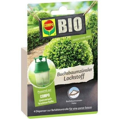 Der Compo BIO Buchsbaumzünsler Lockstoff ist ein Pheromon-Lockstoff zur Bestückung für die Compo Universall-Trichterfalle. Mit dem erzielten Ergebnis können weitergehende Bekämpfungsmaßnahmen mit zugelassenen Pflanzenschutzmitteln abgeleitet werden. Die männlichen Buchsbaumzünslerfalter werden durch einen Sexualduftstoff (Pheromon) in die Falle gelockt, aus der sie nicht mehr entkommen können. Die weiblichen Falter bleiben durch das Ausbleiben der männlich Falter unbegattet und legen keine befruchteten Eier mehr ab.