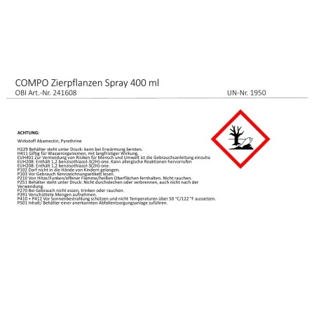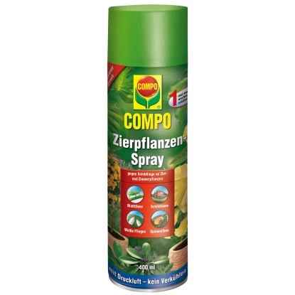 Compo Zierpflanzen Spray ist ein Insektizid und Akarizid mit breitem Wirkungsspektrum. Es wirkt z. B. gegen saugende und beißende Insekten, Weiße Fliegen, Schildläuse, Woll- und Schmierläuse sowie Spinnmilben. Das Spray ist einsetzbar für Zierpflanzen in Zimmern, Büroräumen, auf Balkon und Terrasse, im Gewächshaus und Garten. Es sprüht mit Druckluft, darum kein Verkühlen, und kann auch Kopfüber auf die Blattunterseiten gesprüht werden. Compo Zierpflanzen Spray hat einen angenehmen Geruch und verursacht keine Ölflecken.