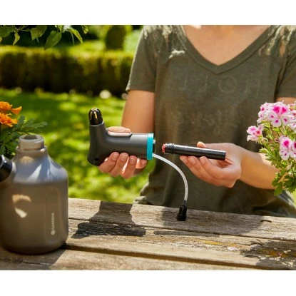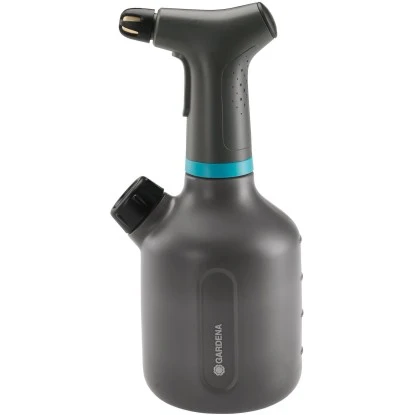 Der Gardena Pumpsprüher EasyPump ist ideal zum sanften Besprühen von Blumen im Haus, auf der Terrasse oder im Garten. Durch Batteriebetrieb ist das Sprühen auf Knopfdruck möglich, ohne Pumpen. Er besteht aus transluzentem Kunststoff. Das Fassungsvermögen beträgt 1 l. Eine zweite Öffnung ermöglicht ein einfaches Befüllen, Beimischen und Entleeren. Der Deckel dient als Dosierkappe für Dünger oder Pflanzenschutzmittel. Ein spezieller Silikonschlauch mit Gewicht verhindert, dass Luft angesaugt wird, so funktioniert der Pumpsprüher auch in schräger Haltung. Mit hochwertiger Sprühdüse aus Messing.