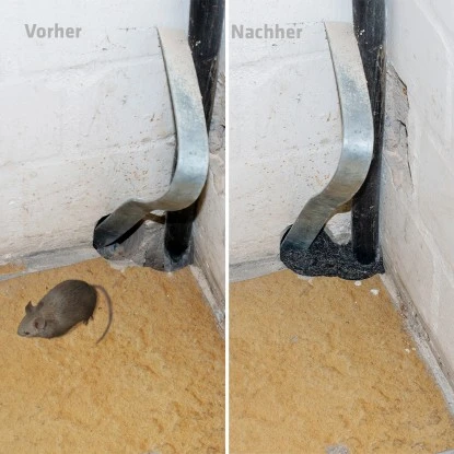 Wo es Löcher und Risse am Haus gibt, finden Mäuse und Ratten den Weg ins innere. Hindernisse wie Bauschaum stellen für ihre scharfen Zähne kein Problem dar – ganz im Gegensatz zur Nager-Barriere Stahlwolle von Gardigo. Einfach mit einer Schere zurechtschneiden und fest in alle Risse und Löcher stopfen. Falls die Tiere kräftig genug sind, die Stahlwolle aus der Öffnung herauszuziehen, kann es zusätzlich mit Dichtmasse fixiert werden.