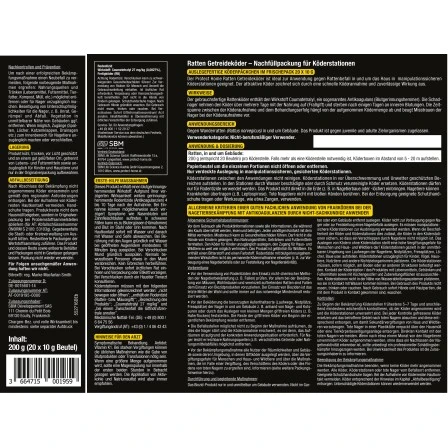 Der Protect Home Ratten Getreideköder 200 g dient zur Bekämpfung gegen Ratten, innerhalb und außerhalb des Gebäudes und ist für nicht-berufsmäßige Verwender zugelassen. Der chemisch-synthetische Köder erzielt eine hervorragende Wirkung gegen Ratten und eignet sich zur Verwendung sowohl in feuchten, als auch in trockenen Räumen. Der vorportionierte Köder ist bequem in der Anwendung, einfach den Köder in einer dafür vorgesehenen Köderstation befestigen und die Köderstation um das Nest oder die Laufwege der Ratten aufstellen (Köderstation nicht im Lieferumfang enthalten).